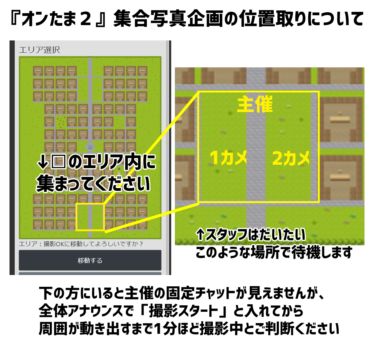 撮影予定時間の5分ほど前から主催アバターで所定位置にいて、上記の固定チャットを出していました。