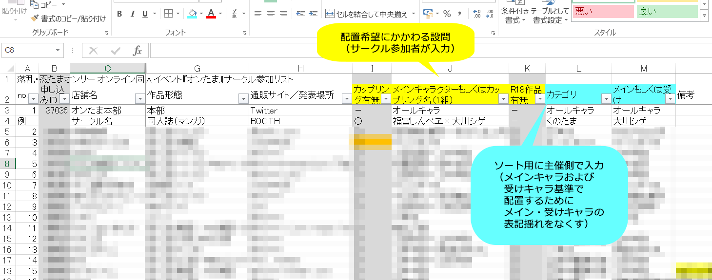 ・配置希望(図の黄色部分)を元にカテゴリ・メインキャラ入力(図の水色部分)